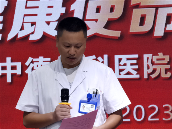 致敬生命,致敬医者仁心。在骨病中心主任冯迎春的带领下,在场医师肃然起立,举起右手,用坚定洪亮的声音,一字一句朗读《中国医师宣言》。铿锵有力的宣言响彻会场,诠释着济南中德骨科医院医师为了人民健康矢志奋斗的坚定决心。